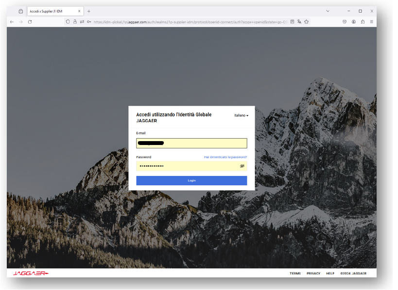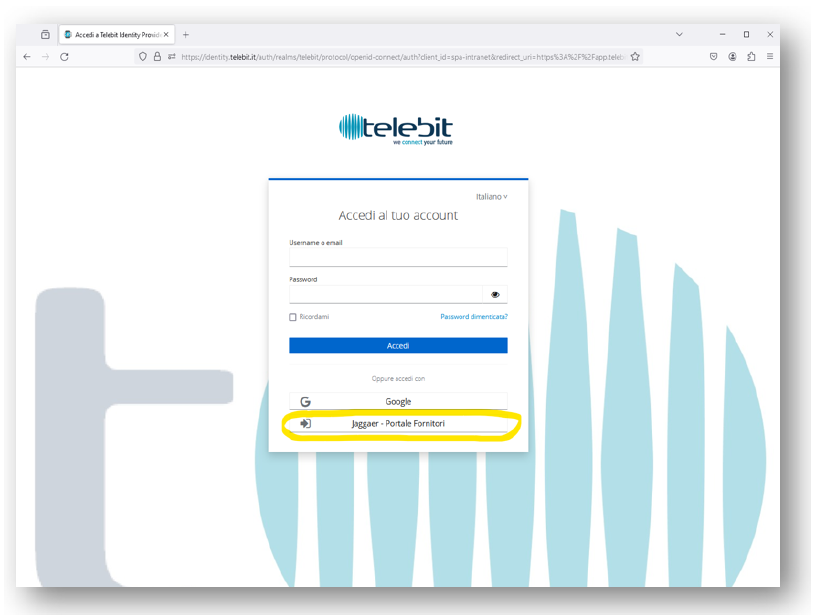 Per l'accesso al sistema collegarsi al sito https://app.telebit.it/ e cliccare sul pulsante "Jaggaer - Portale fornitori".
