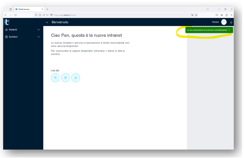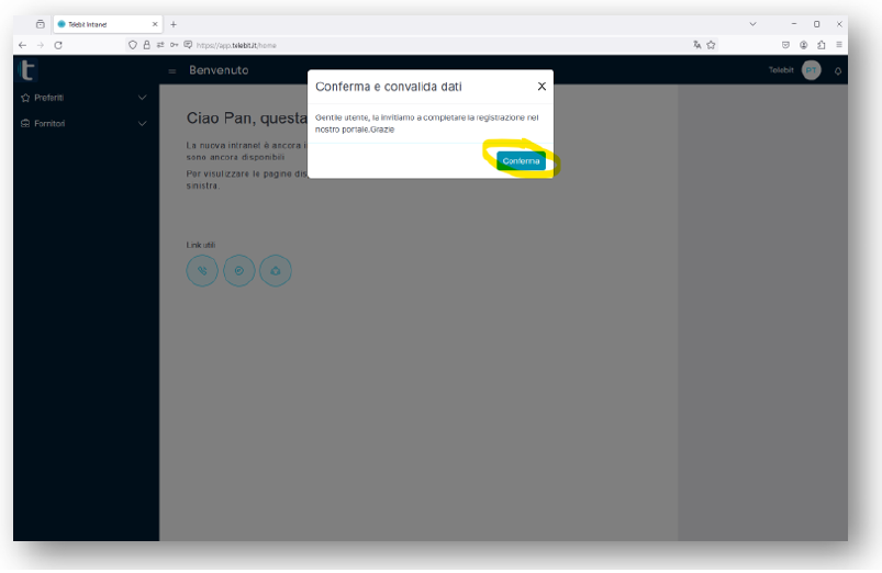 Se l'autenticazione sarà avvenuta con successo atterrete sulla Intranet Telebit e vi sarà chiesto tramite un pop-up, in caso di primo accesso, di confermare e convalidare i dati. Premere quindi su "Conferma".