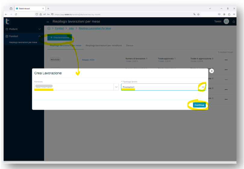 Cliccare ora sul pulsante "Nuova lavorazione" e successivamente specificare la tipologia di lavoro, poi "Continua". Il campo "Fornitore" sarà inserito di default.
