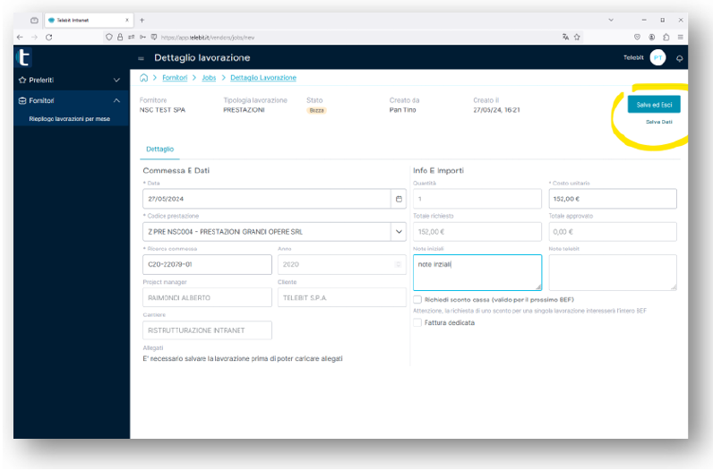 1) BOZZA: riga creata dal fornitore ma non inviata al Project Manager Telebit