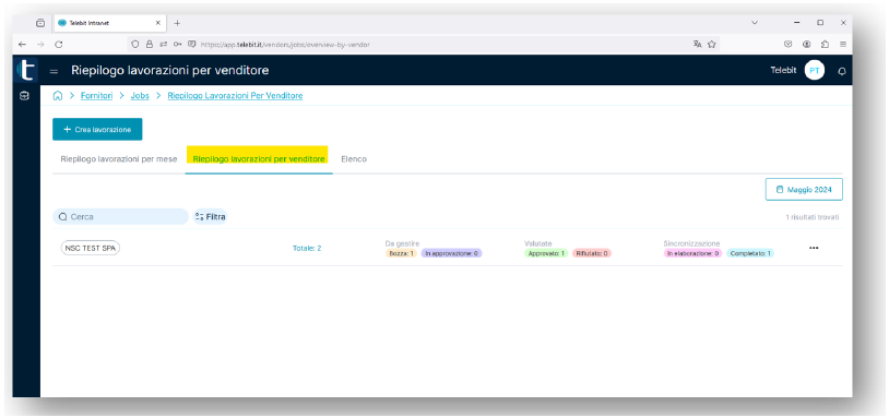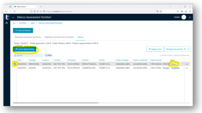 A questo punto per inviare la lavorazione a Telebit è sufficiente selezionare la riga con apposito flag e procedere cliccando sul tasto "invia in approvazione".