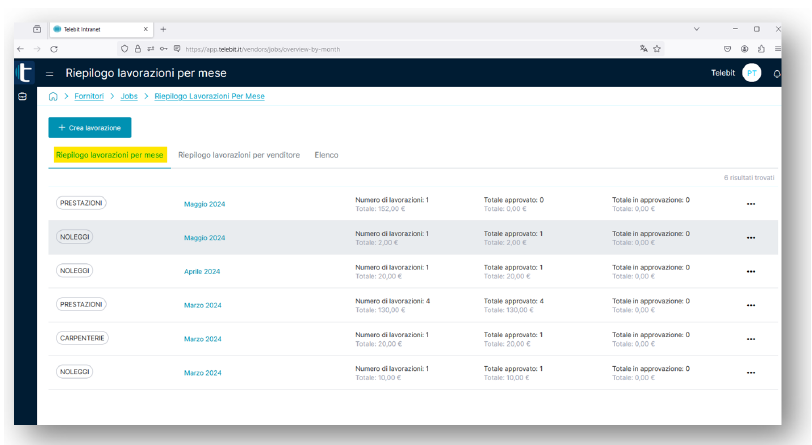 All'interno del tab "Riepilogo lavorazioni per mese" è possibile vedere un riassunto delle lavorazioni sui vari mesi in base alla tipologia di lavoro. Qui saranno contenuti anche i vari importi: totali, approvati, in approvazione.