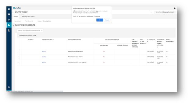 Una volta loggati, nella parte alta della pagina il sistema mostrerà un pop-up che vi porterà alla sezione dei form di categoria modificabili, premere “OK” per procedere.