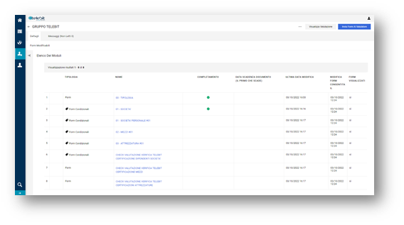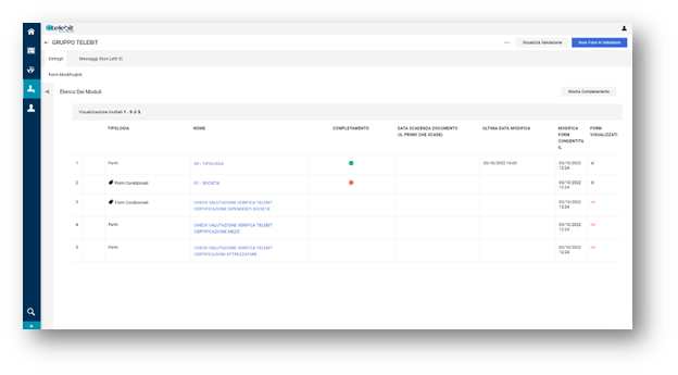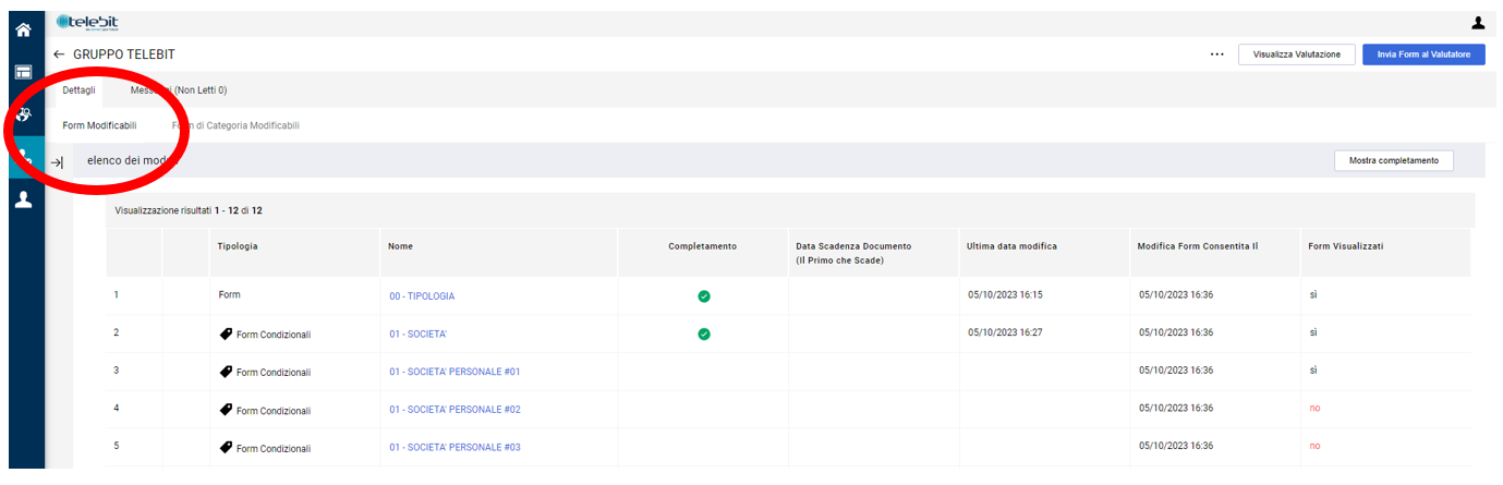 N.B. in ogni caso, prima di procedere all’invio verso Telebit sarà necessario aprire e chiudere tutte le form anche quelle di Check se presenti (la colonna di dx “form visualizzati” deve riportare tutti “si”. Premere ora “Invia Form al Valutatore".