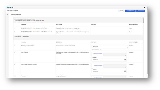 Qualora Telebit abbia ritenuto idonea la prima candidatura (processo di onboarding) si riceverà una mail che rinvierà alla compilazione di altre informazioni associate alla propria categoria merceologica (verificare che la mail non arrivi in SPAM). Cliccando sul link associato si sarà rinviati nella sezione dedicata.