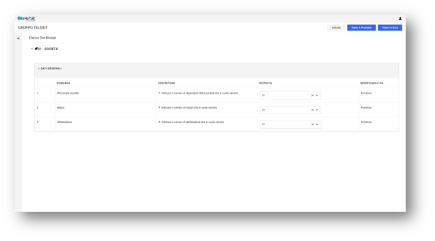Sarà ora necessario definire il numero di personale, mezzi e attrezzature che si vogliono registrare (minimo 1 massimo 30 per tipo). Successivamente premere “Salva & Prossimo".