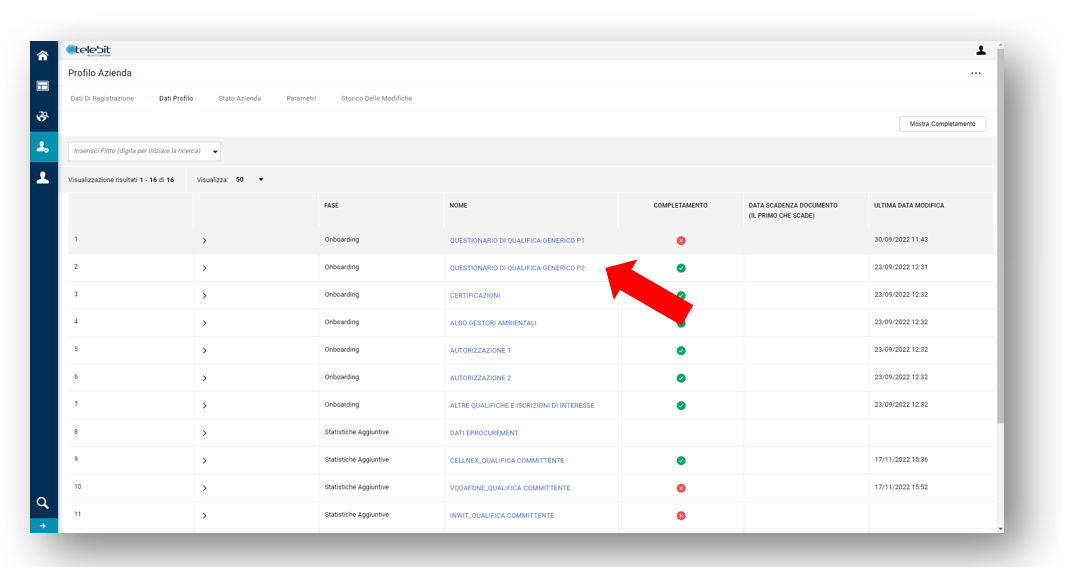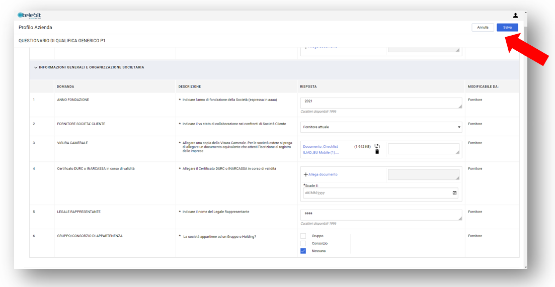 Individuare il questionario dove è contenuto il valore da modificare/aggiornare (es: il DURC o INARCASSA è contenuto in “Questionario di qualifica generico P2”