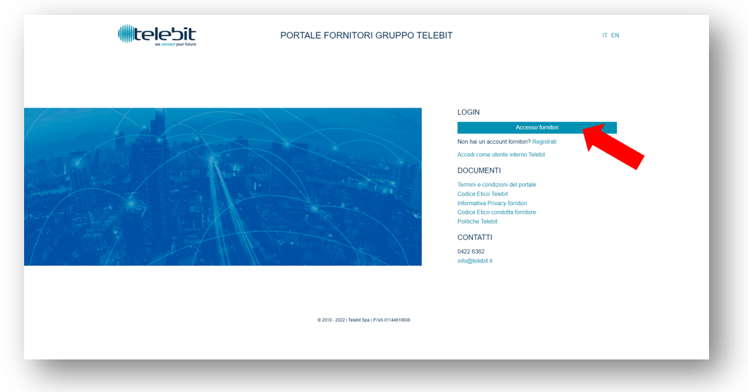 Accedere al sito: https://supplier.telebit.it/ e cliccare su “Accesso fornitori”. Ed effettuare il login con le proprie credenziali