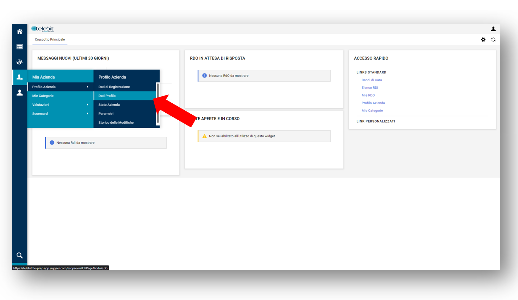 Dal menù laterale cliccare su “Mia azienda -> Profilo Azienda -> Dati di profilo”