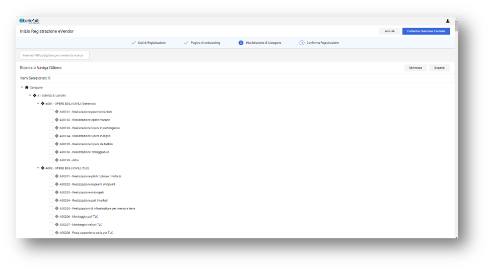 Selezionare la/le categoria/e mercoelogica/he sulle quali si opera. Utilizzare il pulsante “Espandi” per espandere l’albero merceologico. E’ possibile utilizzare il comando di ricerca per accelerare il processo. Successivamente premere “conferma selezione corrente”. Sarà possibile modificare e/o aggiornare queste informazioni anche in futuro.