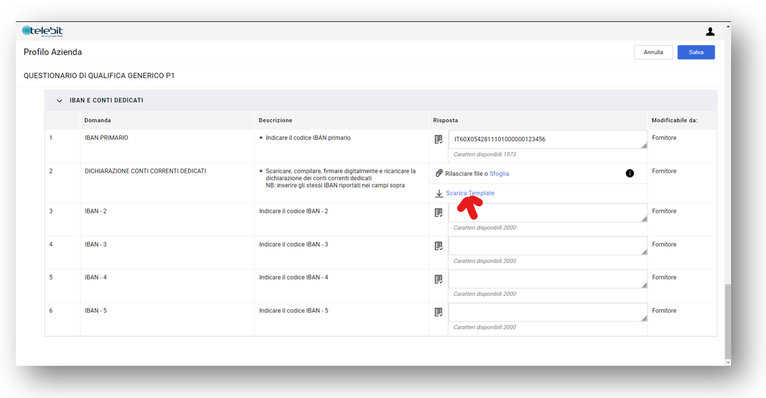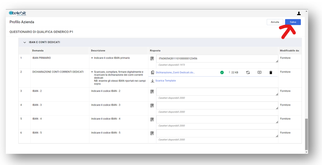 Scorrere in basso fino alla sezione "IBAN E CONTI DEDICATI". Inserire o modificare gli IBAN inserendo codice stato e serie alfanumerica il tutto senza spazi (es: IT60X0542811101000000123456)